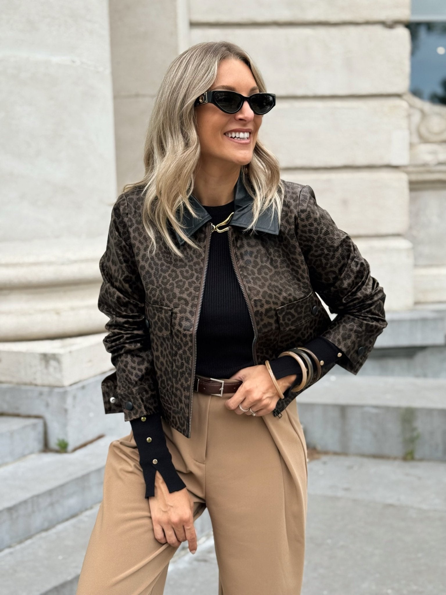 Cette veste incarne une élégance audacieuse. Confectionnée dans un tissu effet cuir de qualité, elle se distingue par sa coupe droite, sa longueur courte et son motif léopard raffiné. Les épaulettes structurées ajoutent du caractère à la silhouette, tandis que la fermeture zippée et les poches fonctionnelles assurent praticité et style.