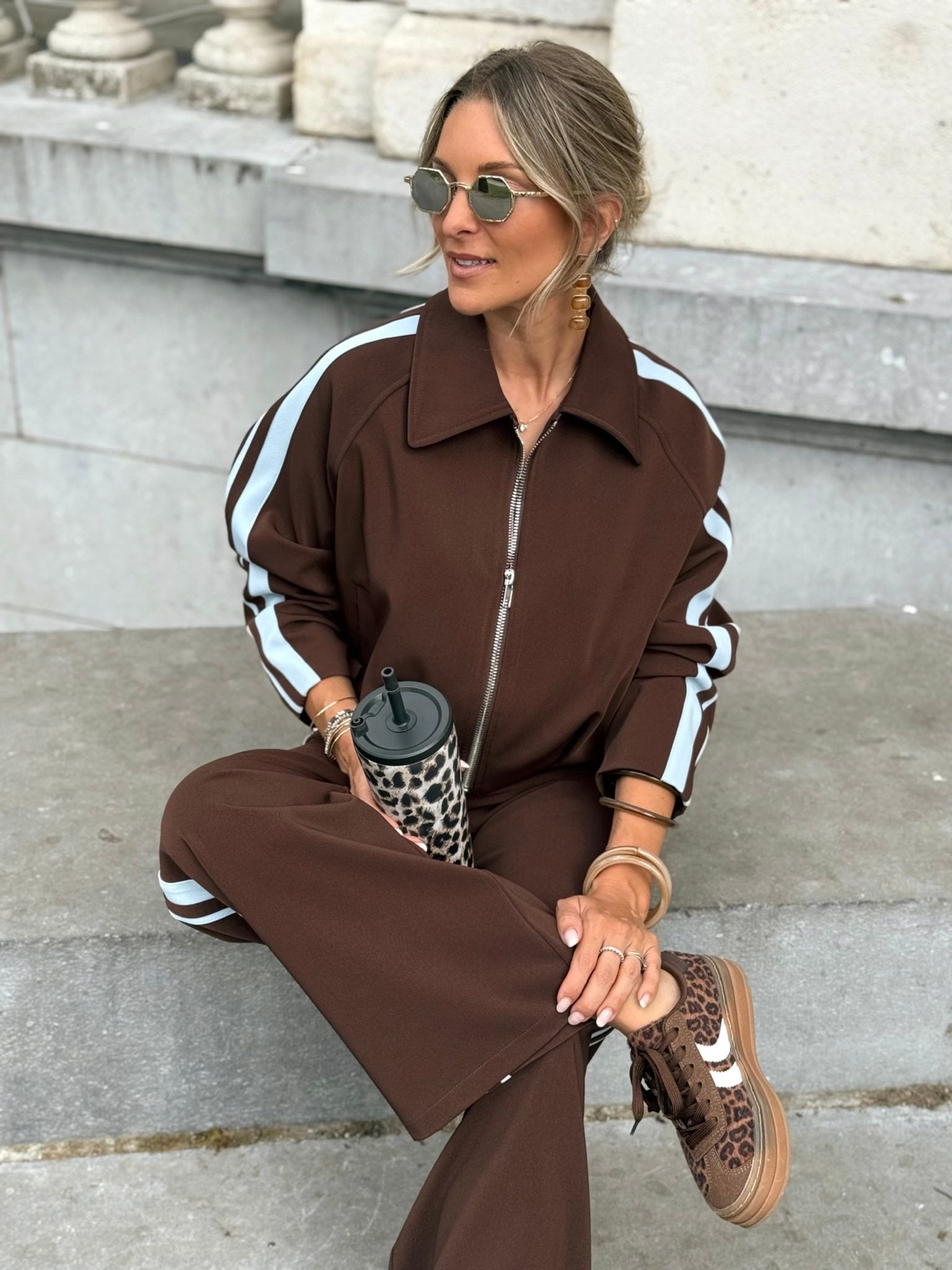 Cet ensemble revisite le style sportswear avec une touche élégante. Conçu dans un tissu premium de belle qualité, il se distingue par sa bande bleu ciel qui court le long de l’épaule et du bras, ajoutant une note moderne et graphique. Sa coupe ample, sa doublure intérieure et ses poches en font une pièce à la fois confortable et pratique. Sa longueur courte lui donne un côté tendance, parfait à associer avec le pantalon Irma pour un ensemble sporty-chic.